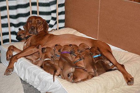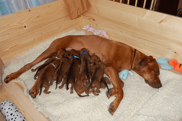Mit einer Punktlandung am 60.Tag der Trächtigkeit schenkte Glenda in der Nacht vom 16. auf 17. September 2013 9 Babies (7 Rüden, 2 Hündinnen) das Leben.