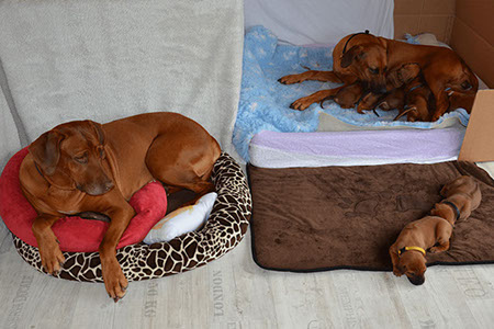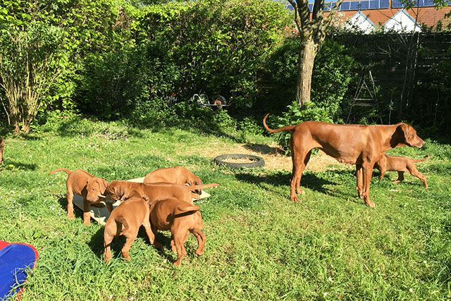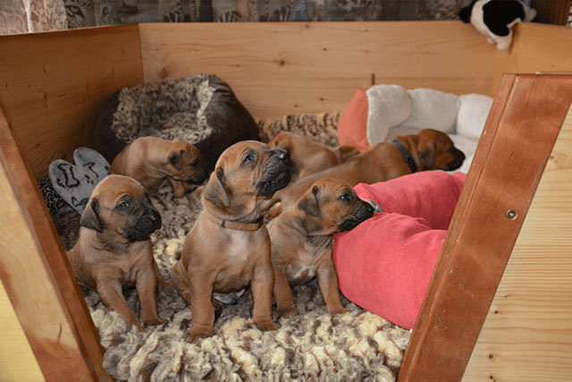 Am 11. April 2018 bekam Arusha 8 kleine Löwenjäger (5 Rüden, 3 Hündinnen). Alle sind wohlauf, gesund und wachsen nun bei ihren Familien zu prächtigen Junghunden heran.