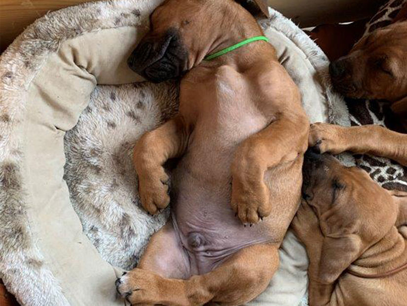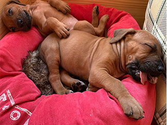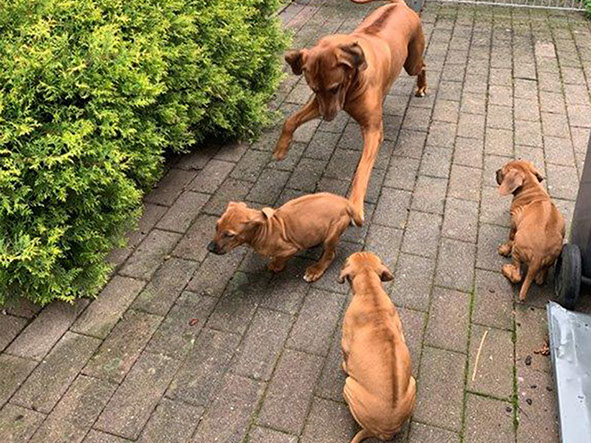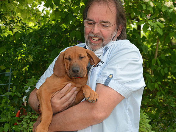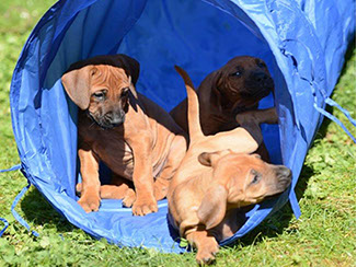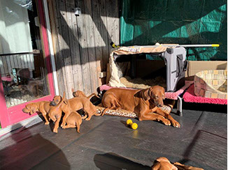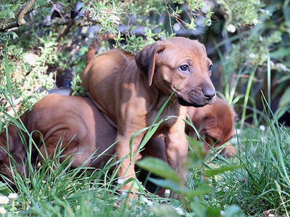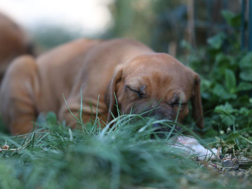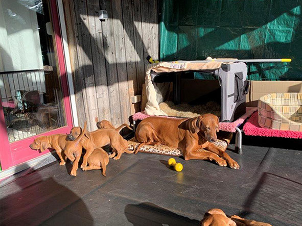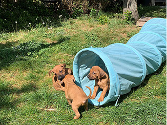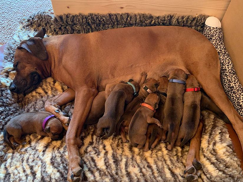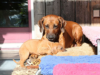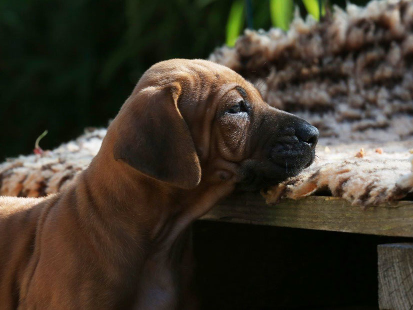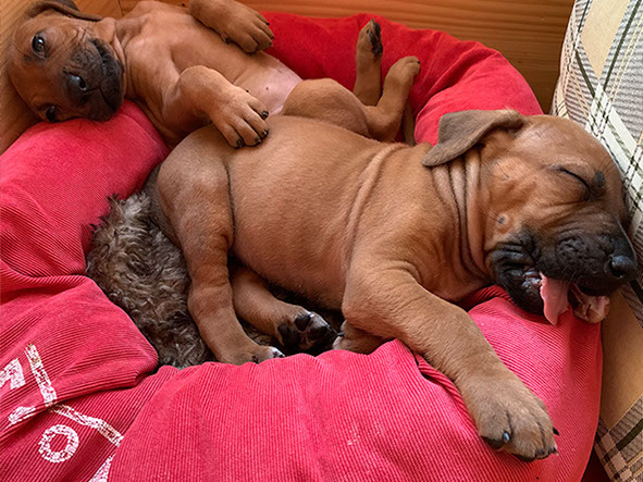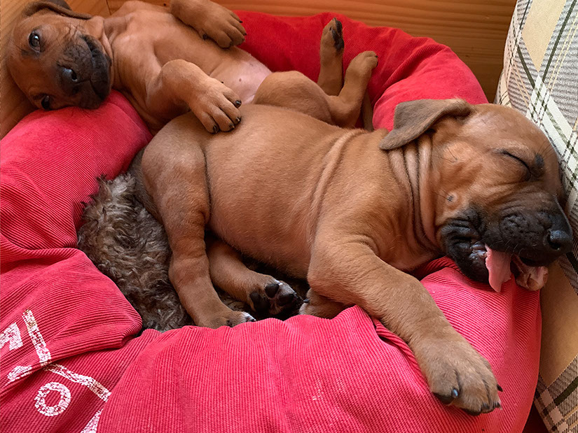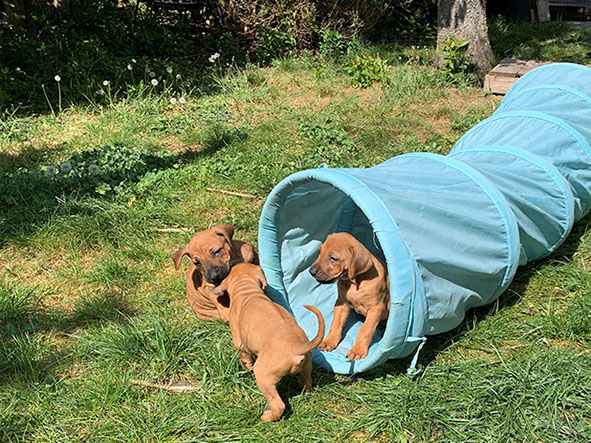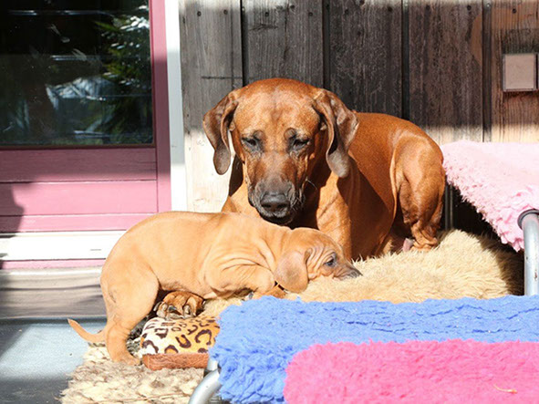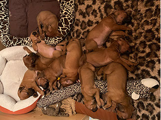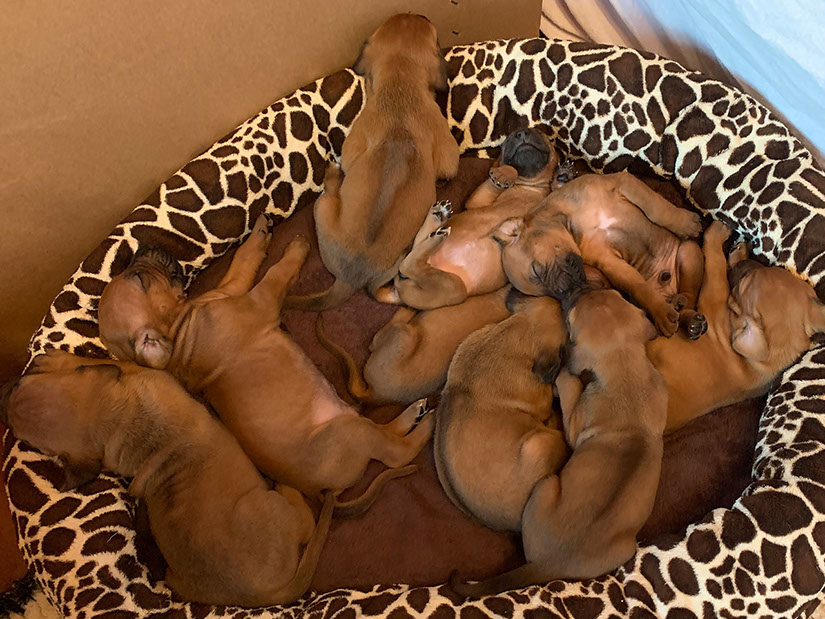Heute sind unsere Welpen acht Wochen alt. Sie haben die letzten Wochen viel Zeit im Garten verbracht und ihre Umwelt erkundet. Mama Arusha und Oma Glenda haben sich in der Erziehung abgewechselt und alle Besucher haben sie nach Strich und Faden verwöhnt und geknuddelt.
